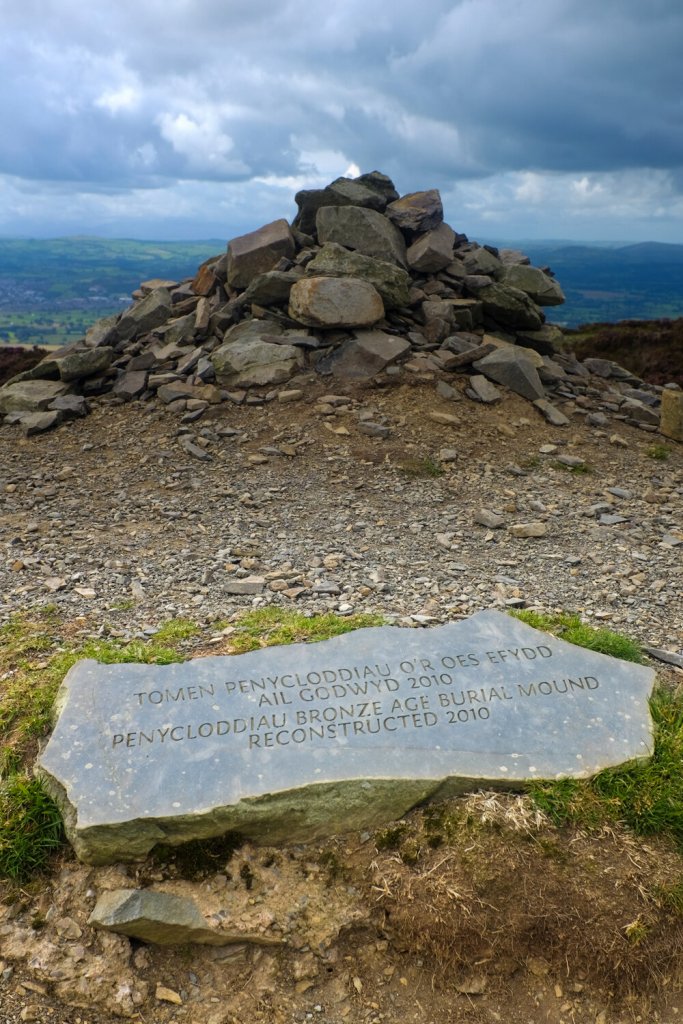 In the Car Park, you’ll see the start of three main paths (plus a narrower one on the extreme right). Take the right hand path of the main three, and follow until the way ahead is blocked, turning right there steeply up the hill, and continue on clear paths to the summit cairn and re-constructed burial mound.