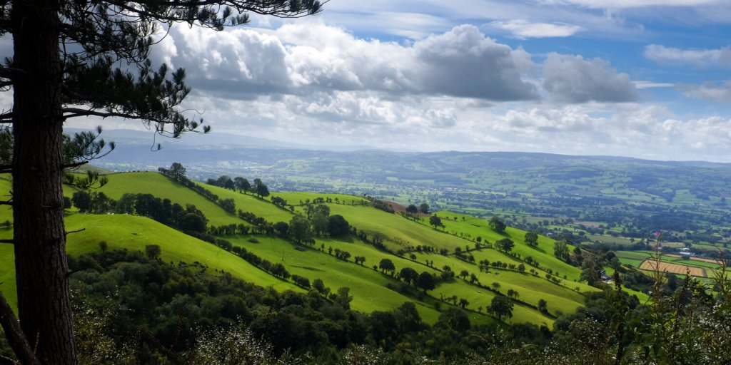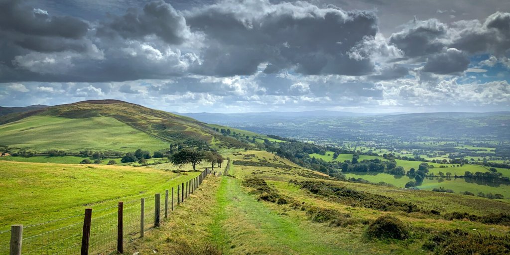 For the full 7.7 km walk, from the summit carry on in the opposite direction to the car park until you reach a col (near a farmhouse to the right). Turn sharply left here onto a bridleway, which follows the contours of the hillside. After crossing the stream Nant Simon, it looks for a while as if you’re heading away from your destination, but as you reach the wood, take a path on your left, which after a bit of a trudge uphill will deliver you quickly back to the car park.
